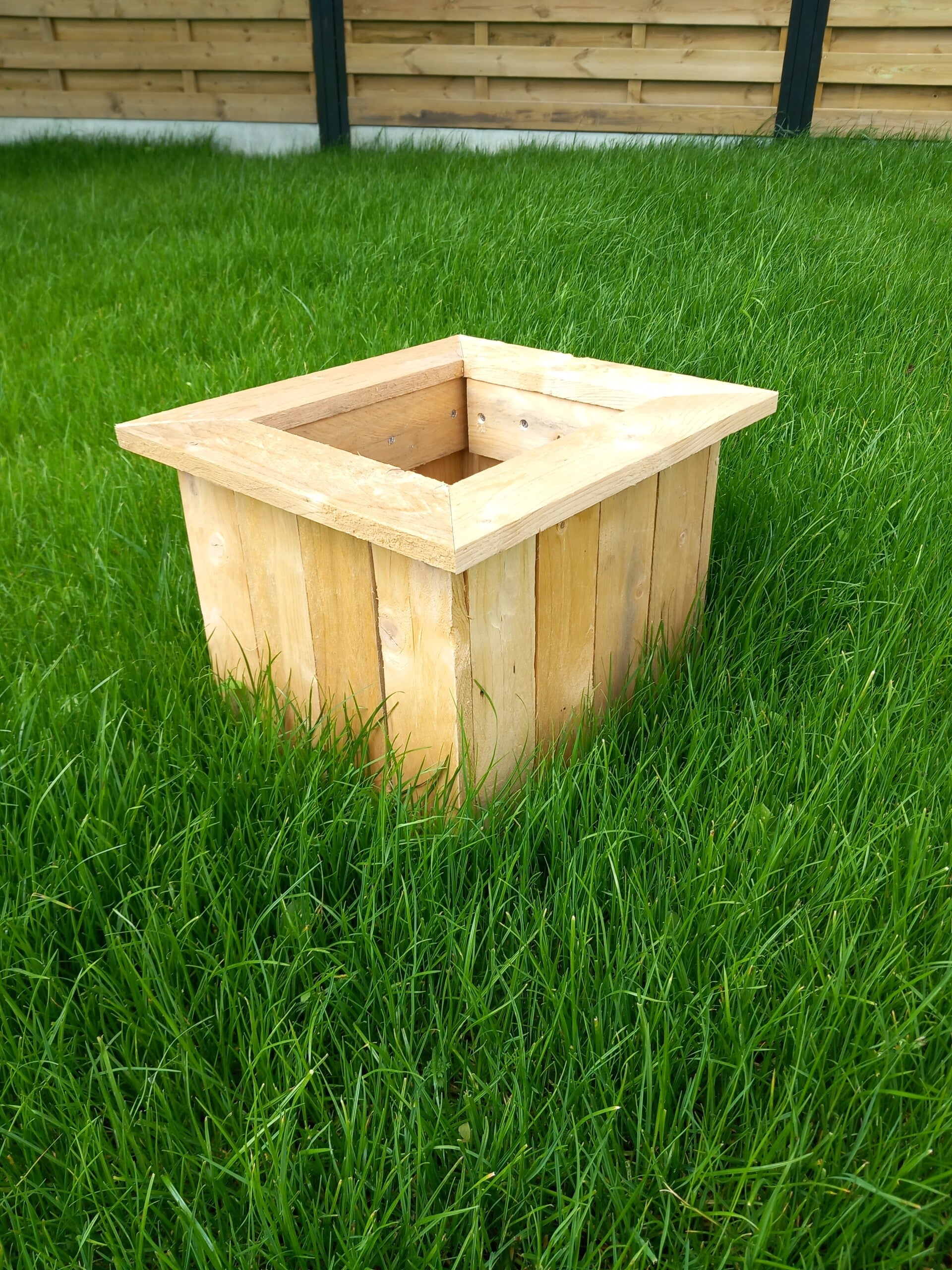 Bloembak met open bodem gemaakt van recuperatiehout.