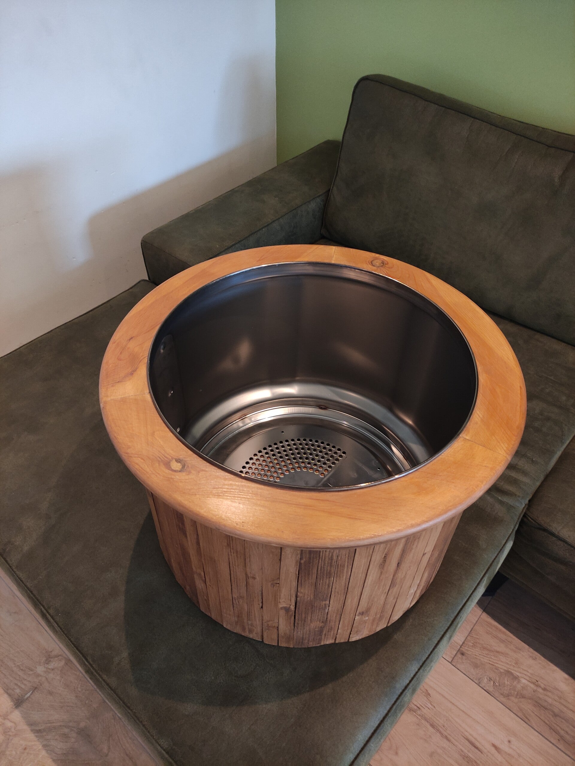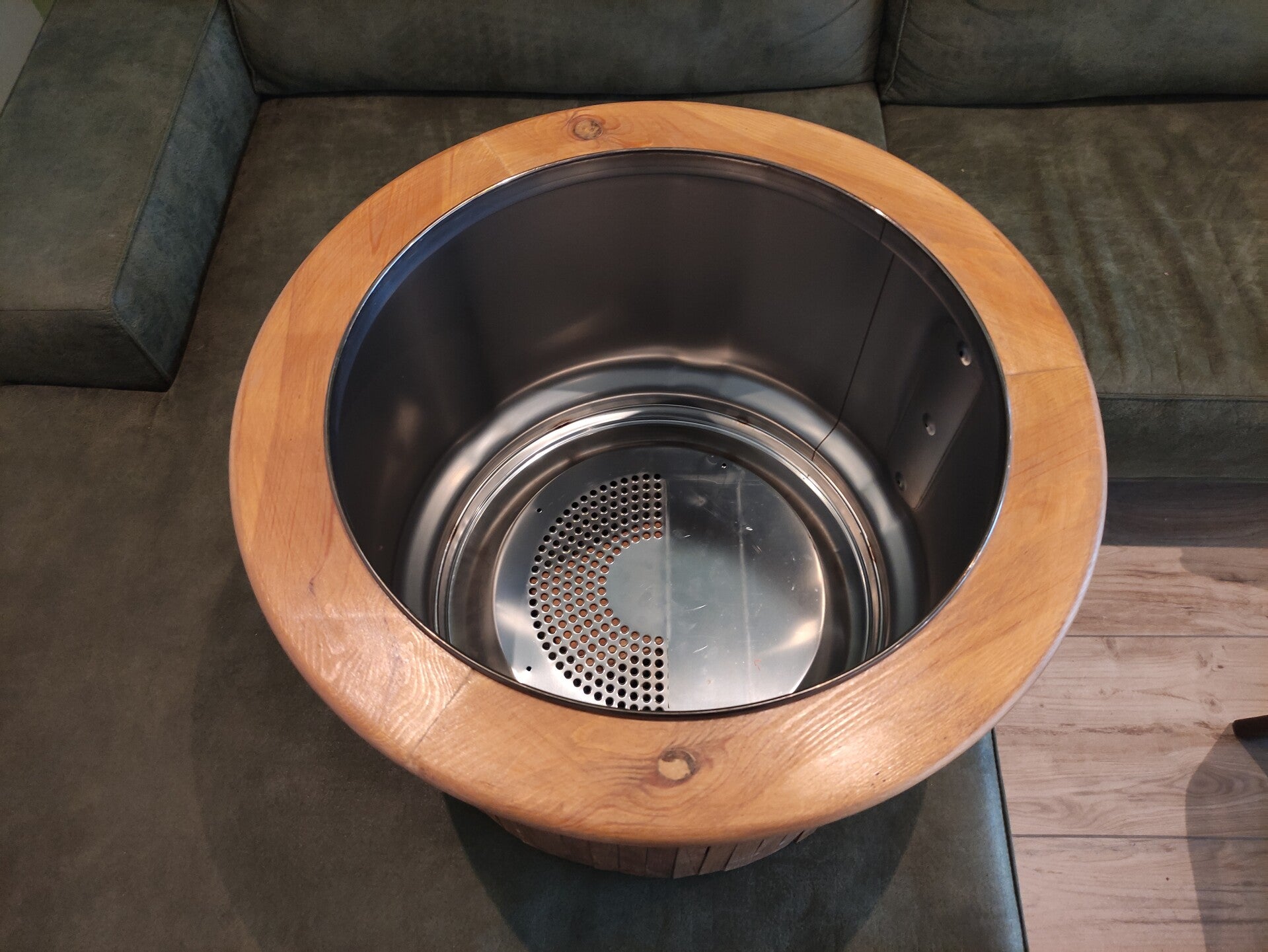 Uniek product. Oude wastrommel belegd met grenen latjes.